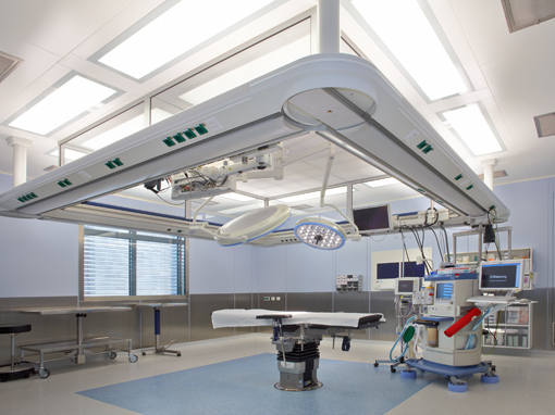 Integrated frame for the housing of the O.R. and sterile field illumination. The frame allows a perfect integration of the laminar flow ceiling and luminaires. Light bodies can be positioned directly in the frame.